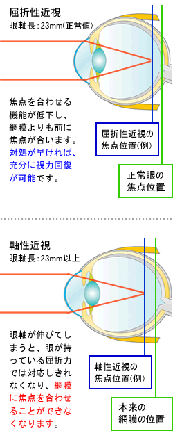 しかし、この屈折性近視の後、眼球の長さが変わり、眼軸が伸びてしまうことによって起こる軸性近視はとても厄介です。