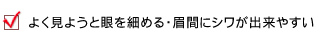 遠くやテレビを見る時に、無意識のうちに眼を細めるときがあり、これを続けていると眉間にシワができやすくなります。 この動作は、眼が悪い人がよく行っており、眼への負担が多い動作になります。お子様がこのような動作をしている場合、要注意です。